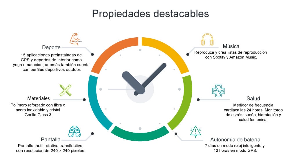 - Duración de la batería: 7 días en modo reloj y 13 hrs en modo GPS